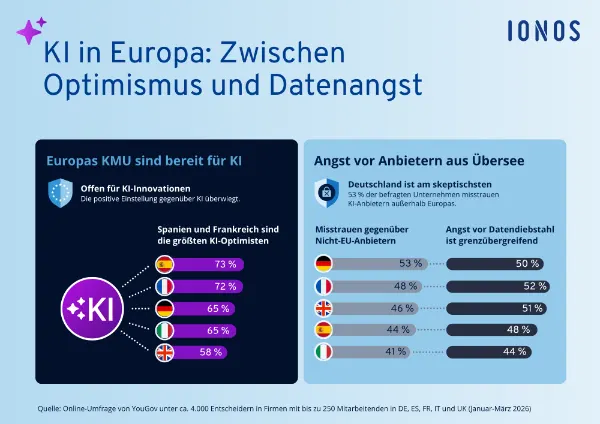 Zwei Drittel der kleinen und mittelständischen Unternehmen (KMU) in Deutschland stehen KI positiv gegenüber. Gleichzeitig fürchtet mehr als die Hälfte, dass ihre Daten in den USA oder China landen. Das zeigt die jährliche Digitalisierungsstudie von IONOS, Europas führendem Digitalisierungs-Partner, in Zusammenarbeit mit YouGov*.